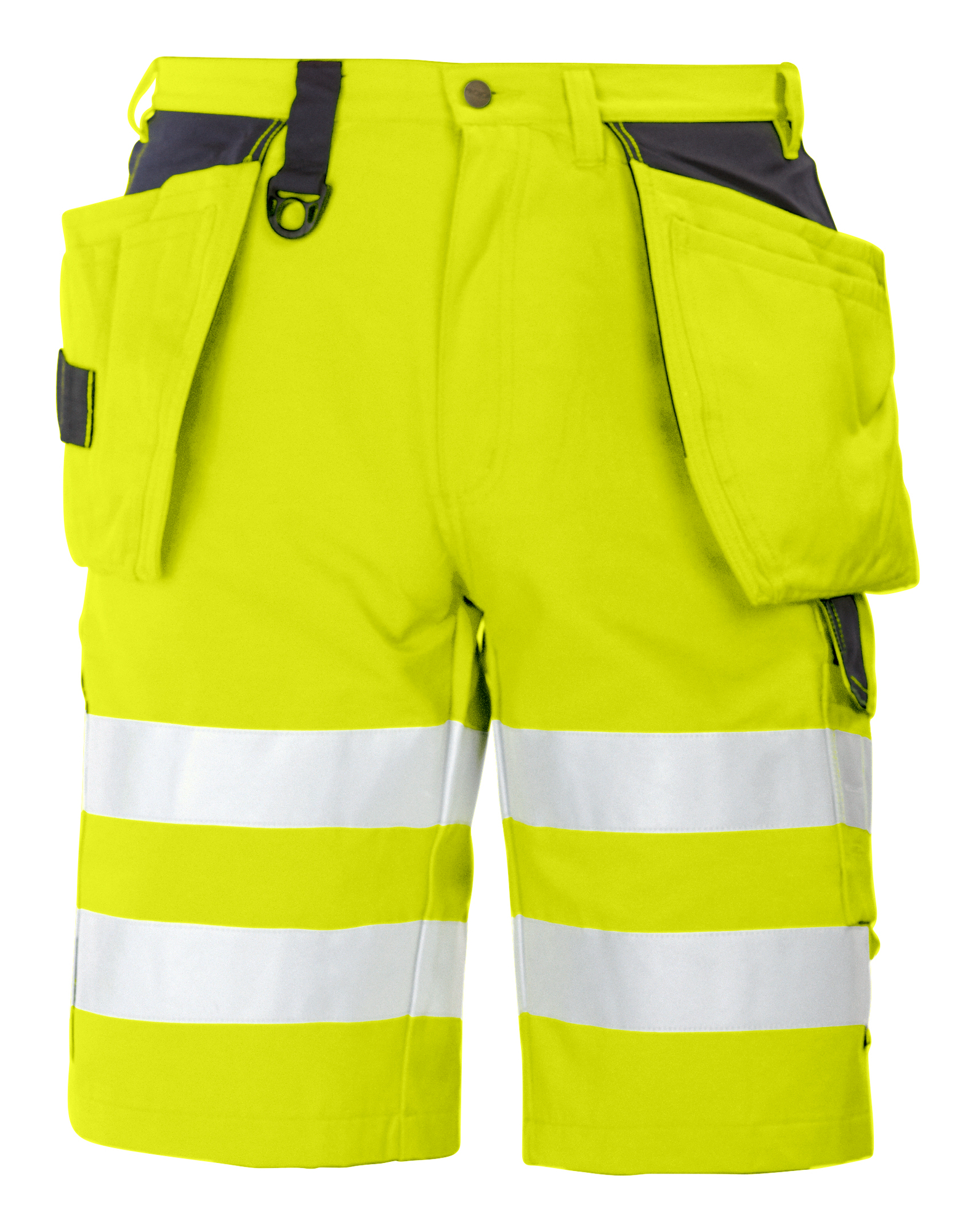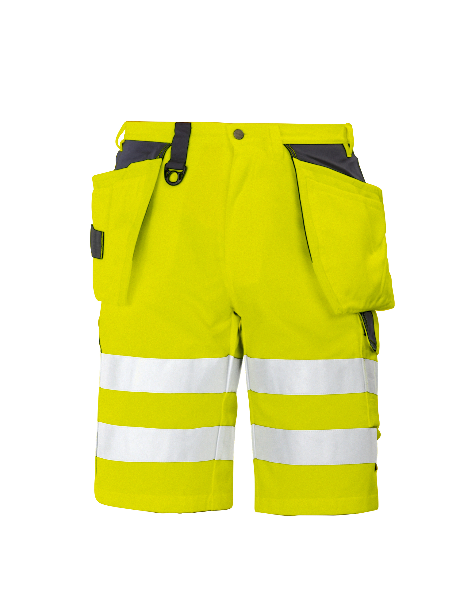 Introducing the 6503 SHORTS EN ISO 20471 CLASS 2/1, the perfect combination of functionality and safety for those working in high-visibility environments. These shorts are designed with holster pockets that can be conveniently tucked into side pockets on both sides. The left side features an extra pocket with a secure flap and press-stud closure, as well as a specialized internal phone pocket and a bracket for an ID card. The right side includes a designated pocket for a folding rule and an additional pocket for tools, complete with a knife button for easy access. With back pockets that offer extra width, these shorts ensure that you have ample storage while maintaining comfort. Furthermore, they come equipped with two adjustable hammer loops for practicality and two D-rings at the waistband for added convenience. Our shorts are reinforced with high-quality Cordura® fabric, providing enhanced durability and longevity, making them an ideal choice for demanding work conditions.