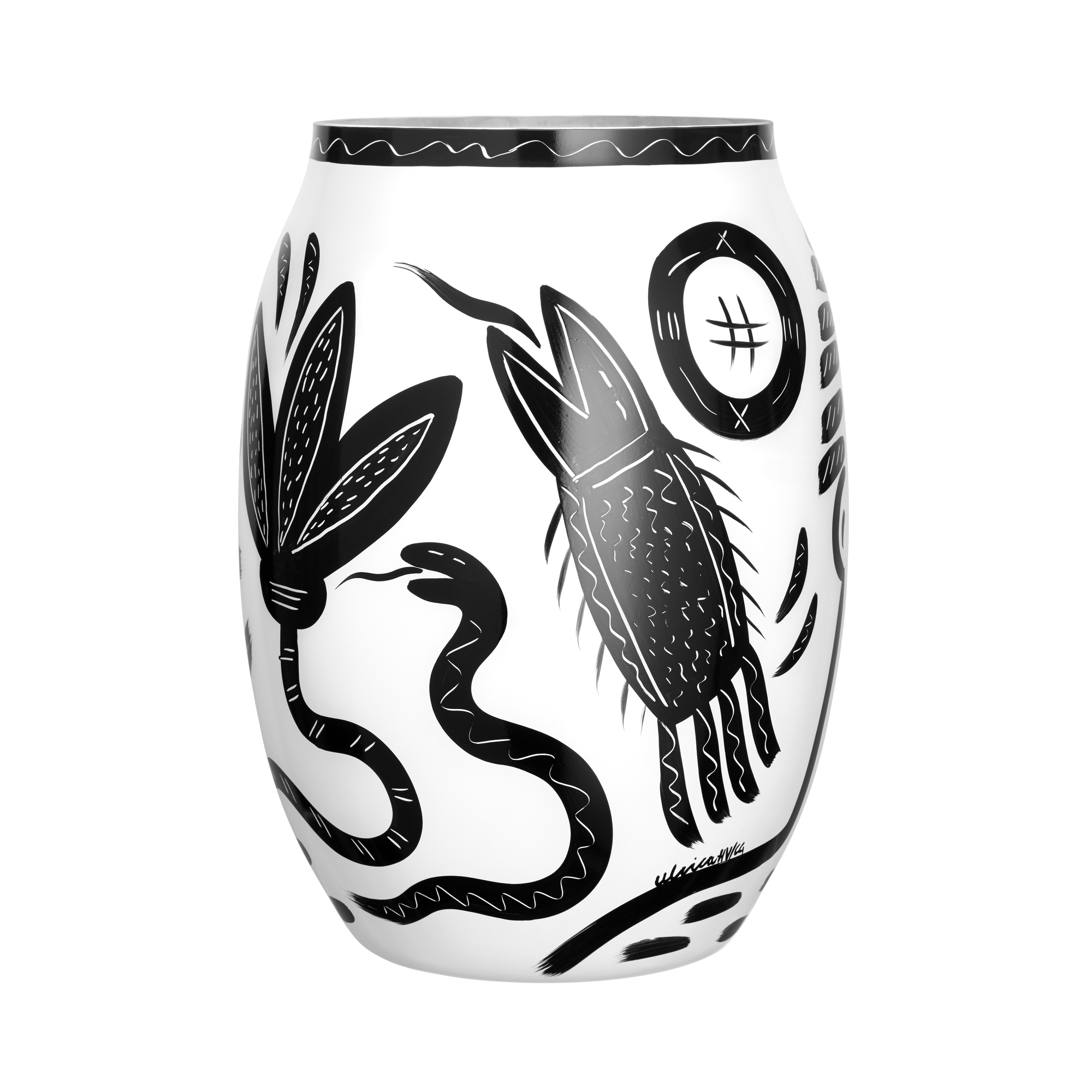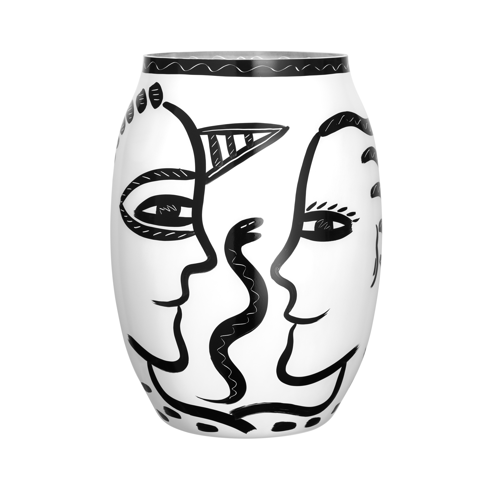 The Caramba vase white 340mm is a stunning piece of art that combines elegance and emotional depth. Inspired by a trip to Mexico, this vase is part of a renowned Kosta Boda series that dates back to 1986. The phrase "¡Ay, caramba!" encapsulates the bold spirit of this design, conveying feelings of admiration and surprise. The vase features captivating hand-painted black details that contrast beautifully with its mouth-blown white glass body. Designed by the celebrated artist Ulrika Hydman Vallien, this vase is not only a functional item but also a striking decor piece that can elevate any space. Ideal for showcasing fresh flowers or serving as a standalone accent, the Caramba vase is a perfect addition to homes and businesses alike. Its unique design ensures it will be a conversation starter, making it a desirable choice for discerning customers.