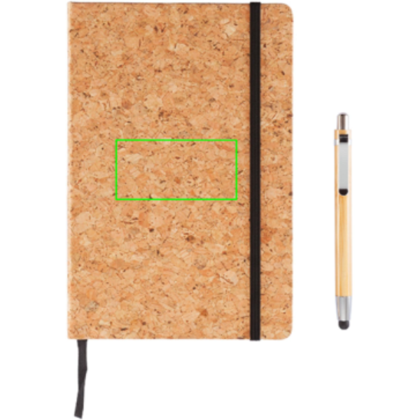 Den A5 notesbog med bambus styluspen er det perfekte valg for dem, der ønsker et miljøvenligt alternativ til deres skrivebehov. Denne økovenlige notesbog er lavet af naturligt kork og indeholder 160 sider med en vægt på 80g. Den har en elegant sort sideadskillelse og et sort elastikbånd, der holder dine noter sikkert lukket. Med en bambuspen med stylus-spids og kuglehoved har du alt hvad du behøver til at tage noter og skrive på din tablet eller smartphone.