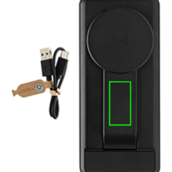Denne powerbank er udstyret med et pålideligt klasse A 10.000 mAh litiumpolymerbatteri, der sikrer langvarig og effektiv opladning. Den har desuden en praktisk foldbar integreret 15W magnetisk trådløs opladerstander, en 5W sekundær trådløs oplader og en 2,5W uroplader til IOS-ure. Med strømindikatorer kan du nemt holde øje med det resterende energiniveau.
